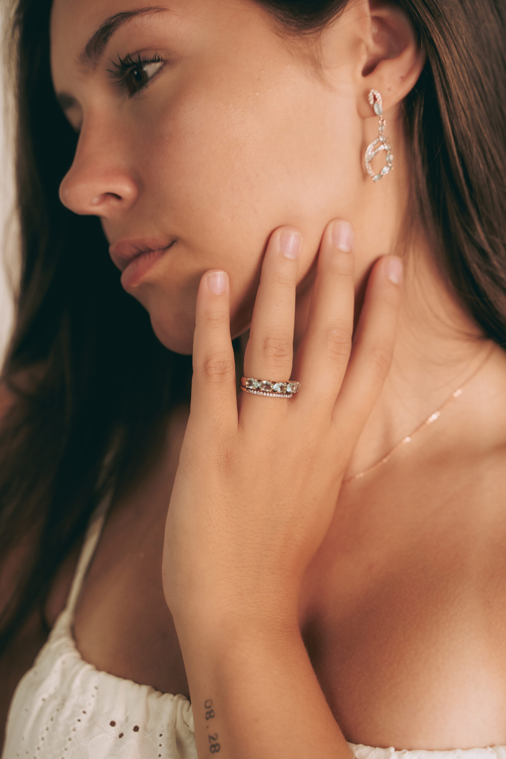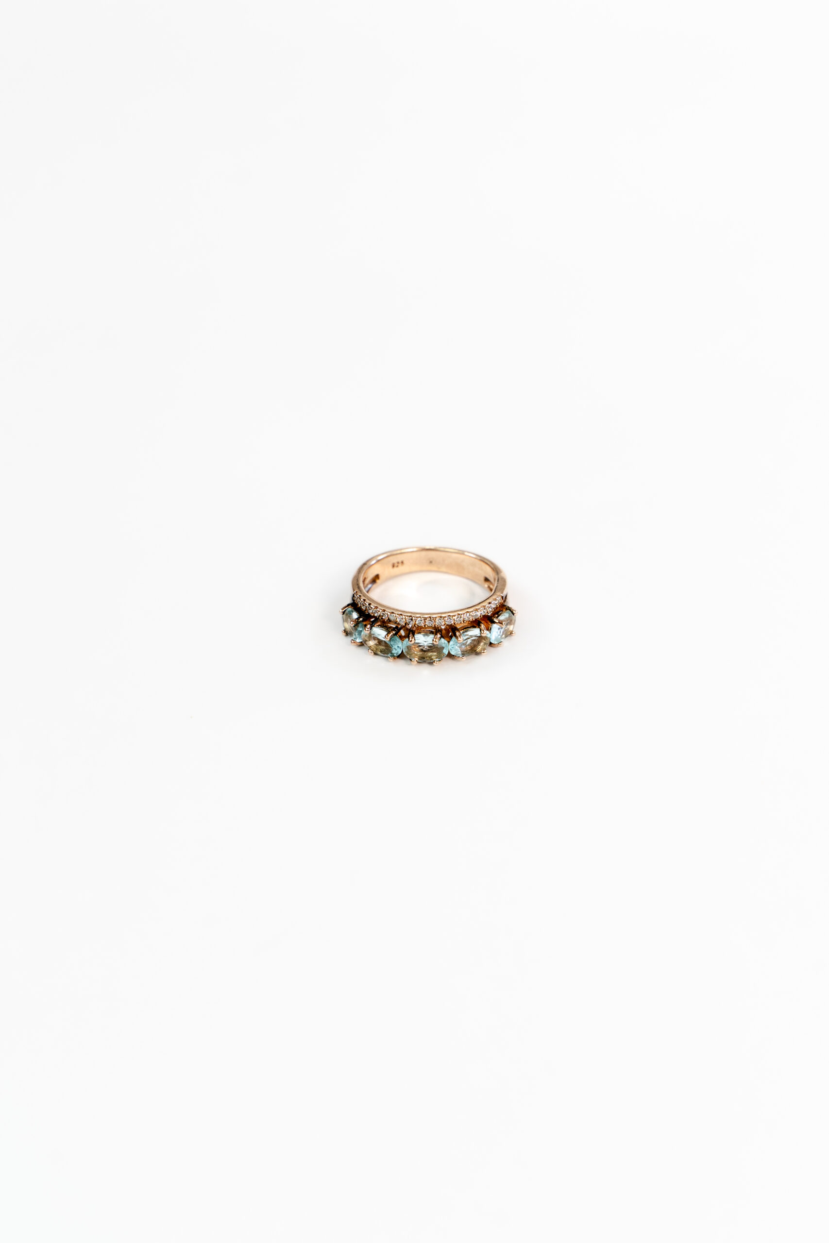 Anell  de plata rosada doble, una part llisa i l’altra decorada amb circonites blaves de quatre grapes, que combina simplicitat i brillantor en un disseny modern i equilibrat.