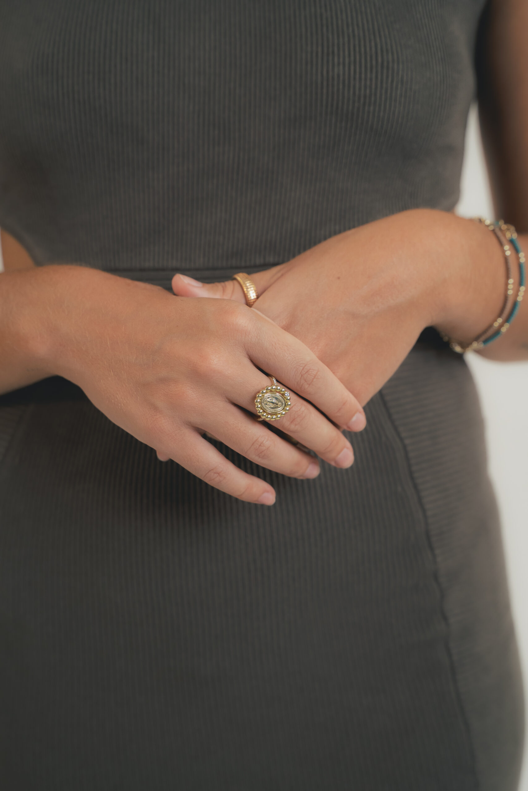 Anell de plata daurada i circonites en forma de segell amb imatge de la Verge Miraculosa.
