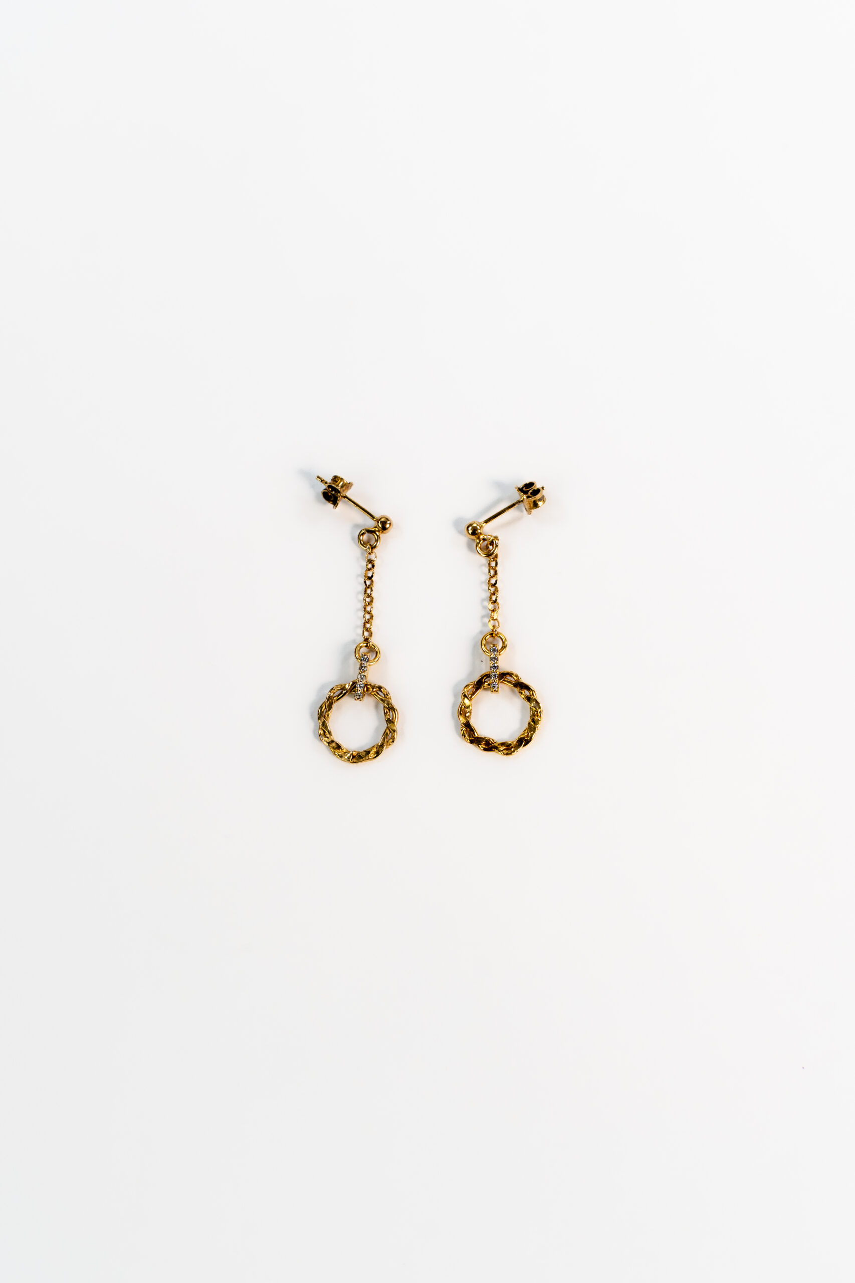 Arracades de cercle amb cadena penjada, elaborades en plata daurada. Un disseny modern i versàtil que combina moviment, estil i elegància minimalista.