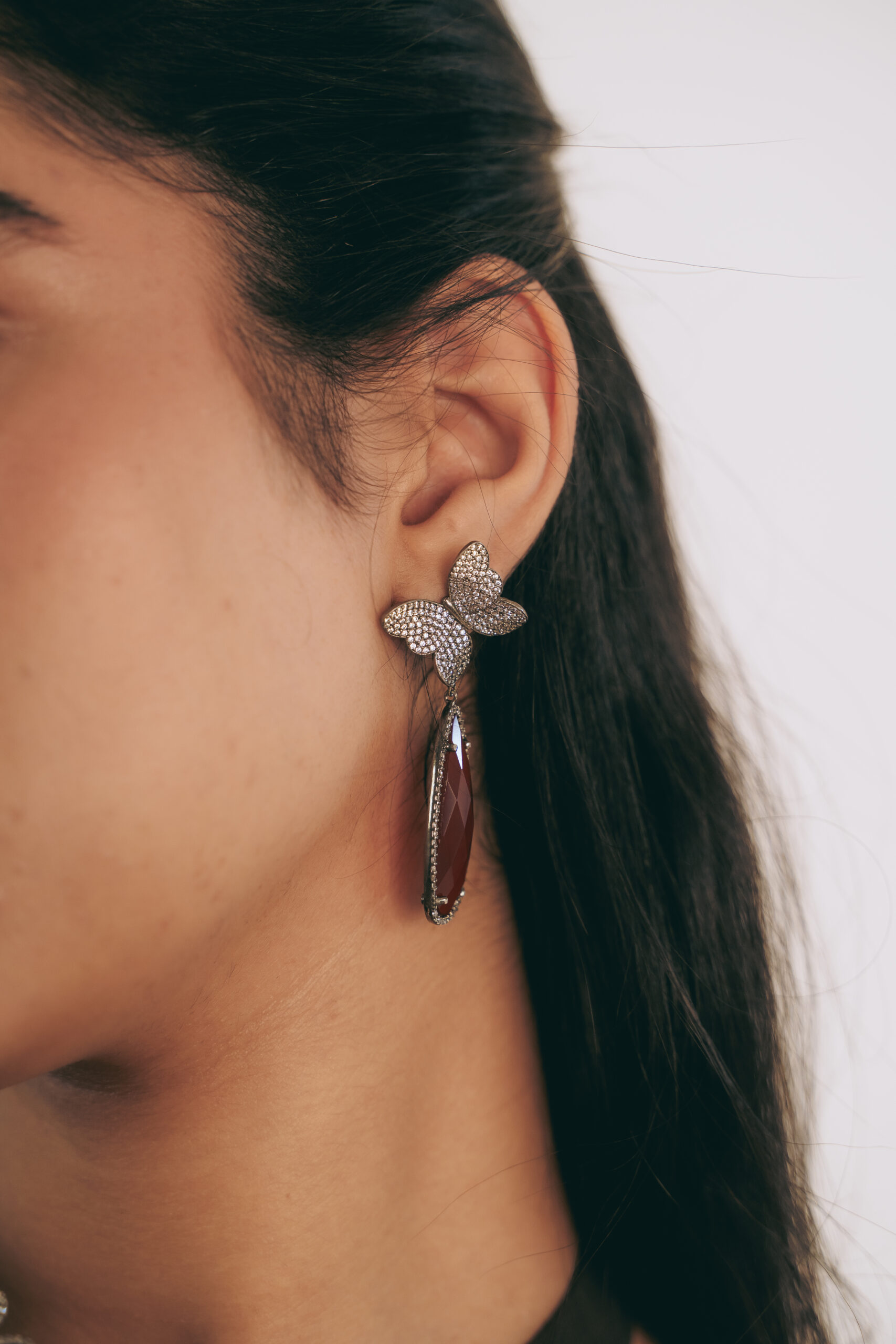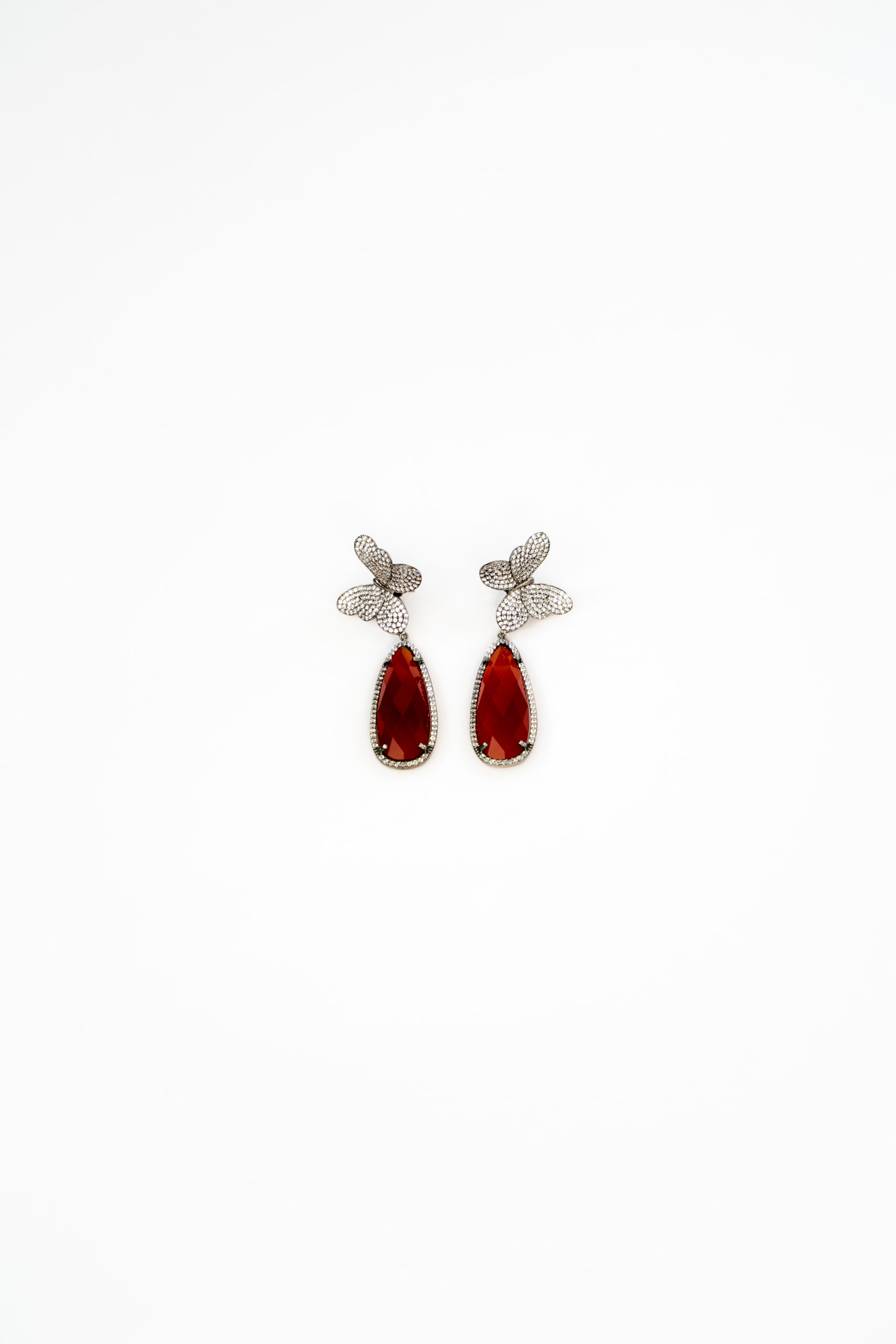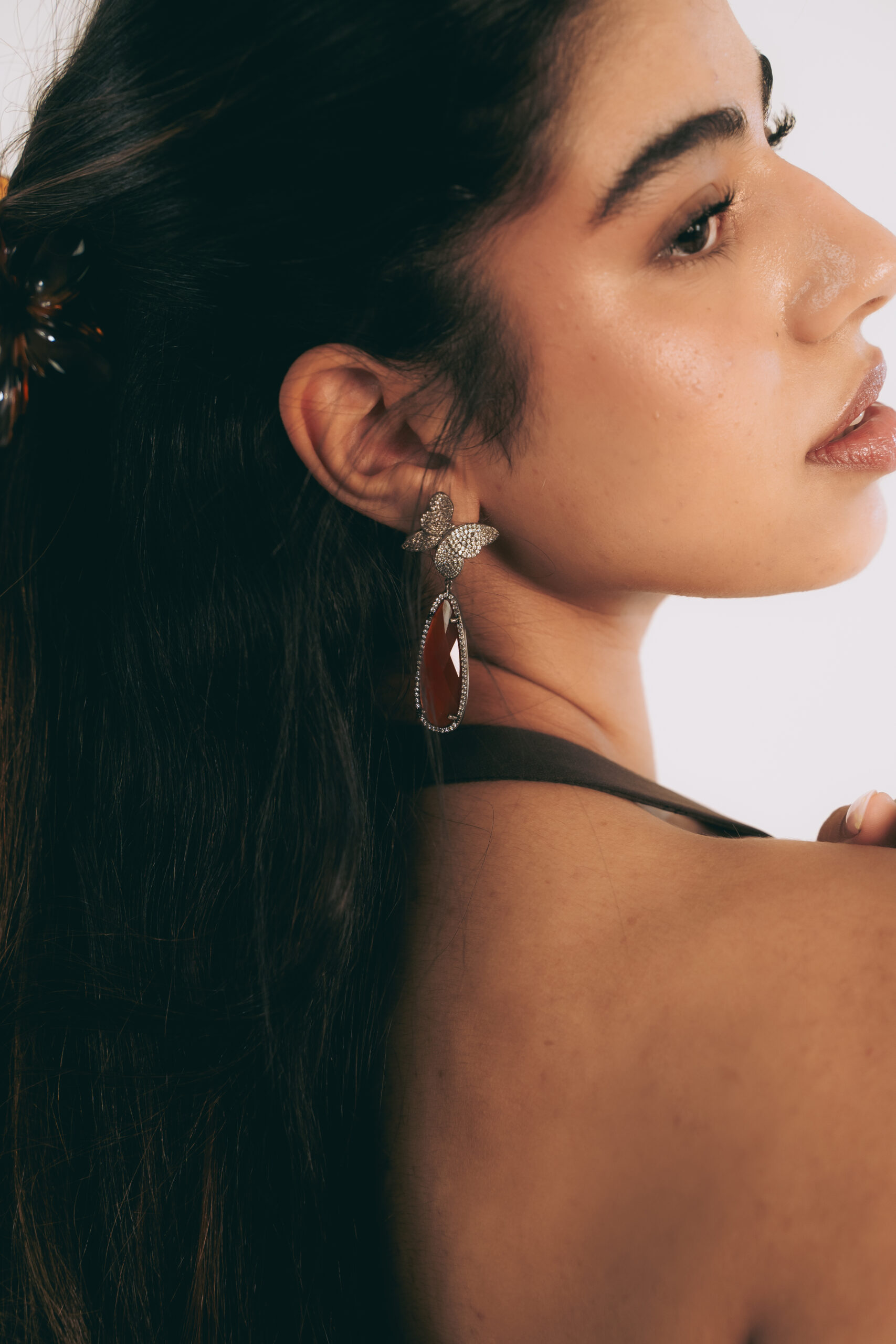 Arracades en forma de papallona amb una pedra ataronjada que aporta llum i vitalitat. Una peça alegre i delicada, inspirada en la natura i el color.