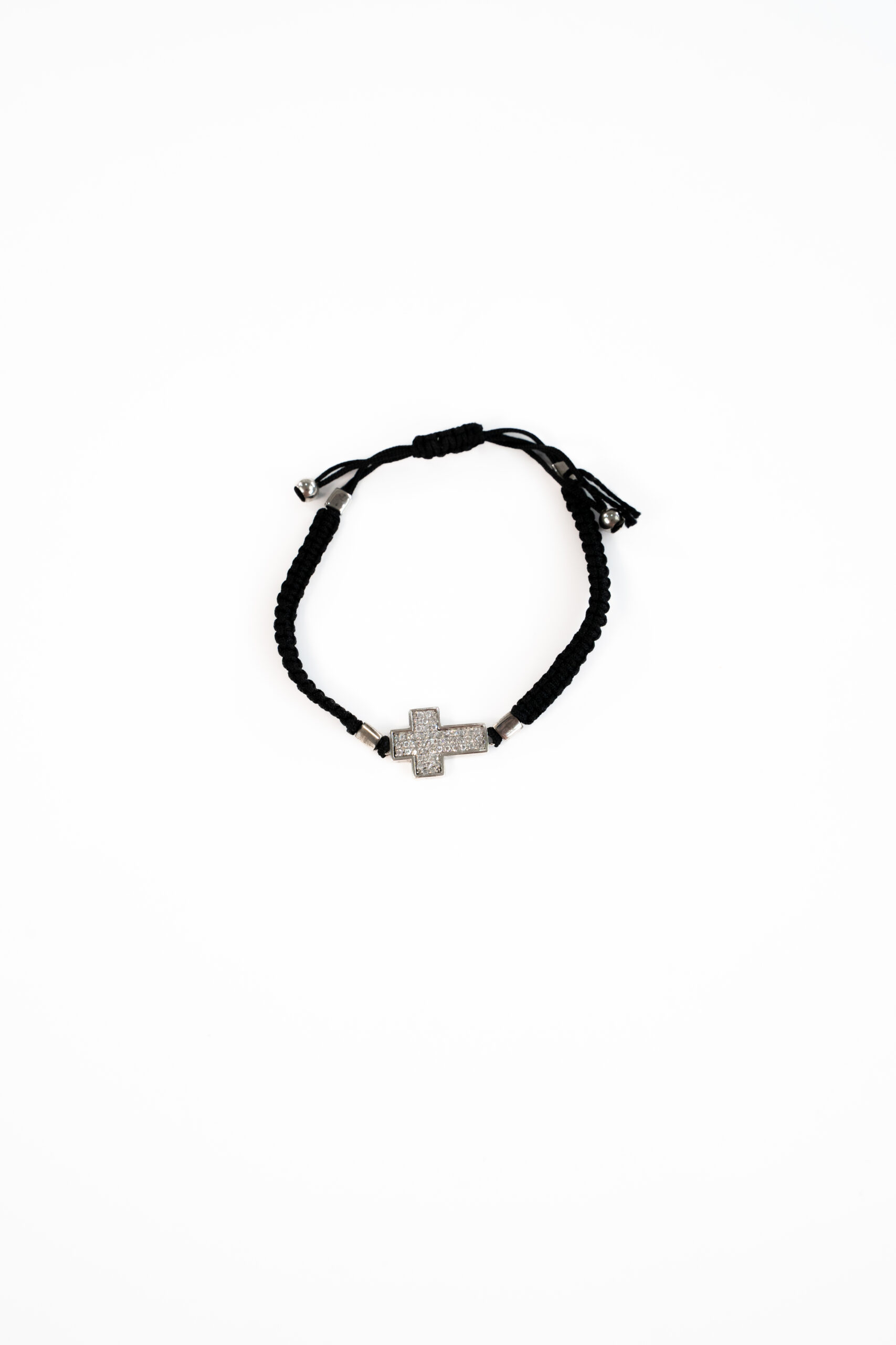 Braçalet de macramé de plata amb penjoll de creu amb circonites.