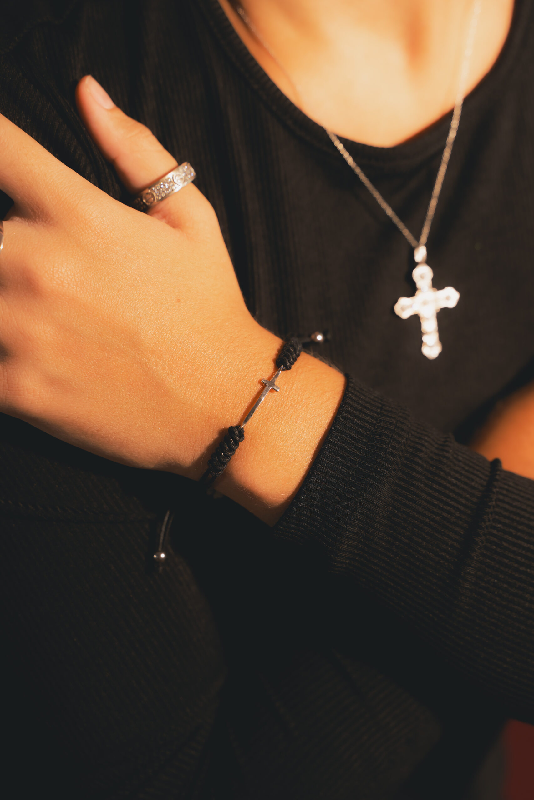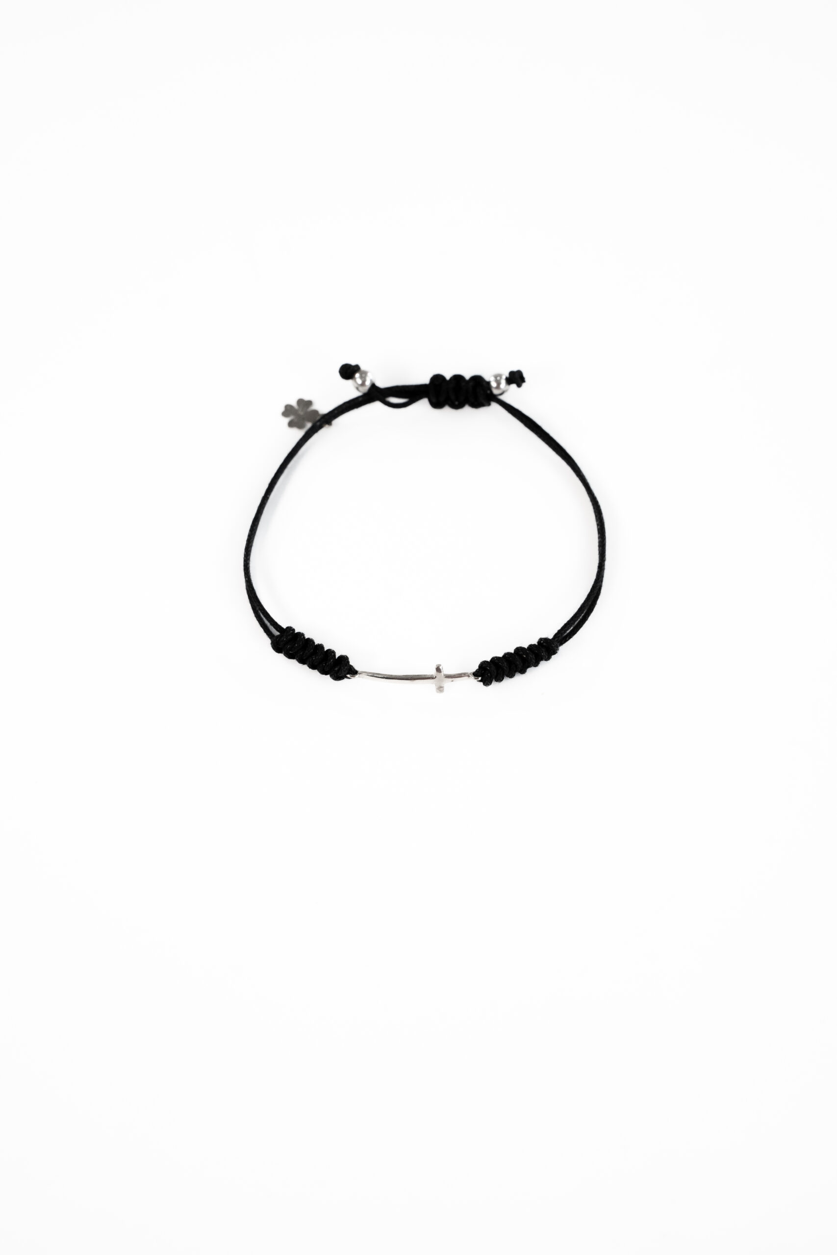 Braçalet de macramé amb penjoll de creu de plata llis, elegant i versàtil.