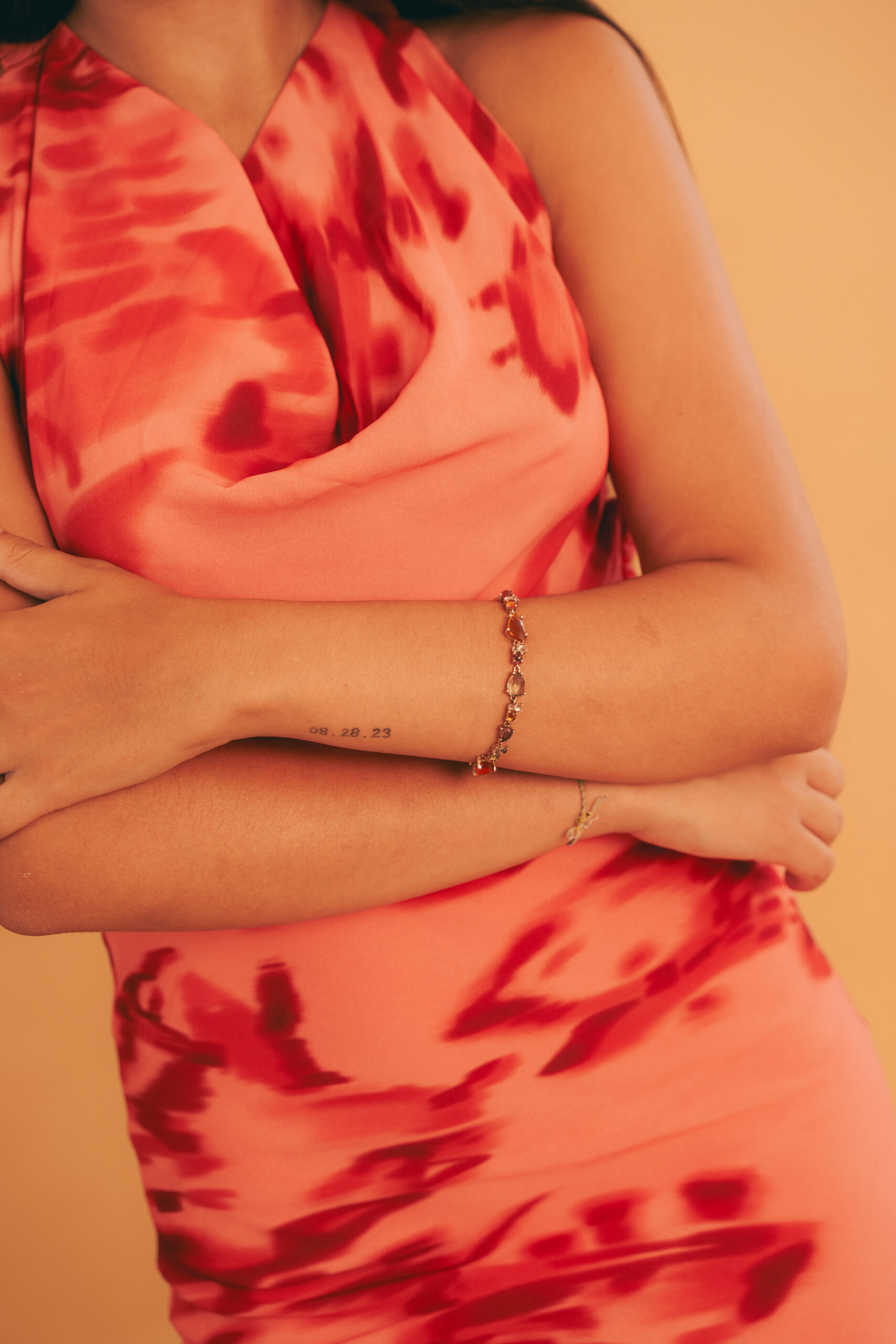 Braçalet de plata rosa amb circonites de diferents colors, inspirades en els tons vius de l’estiu. Una peça alegre, lluminosa i plena d’estil.