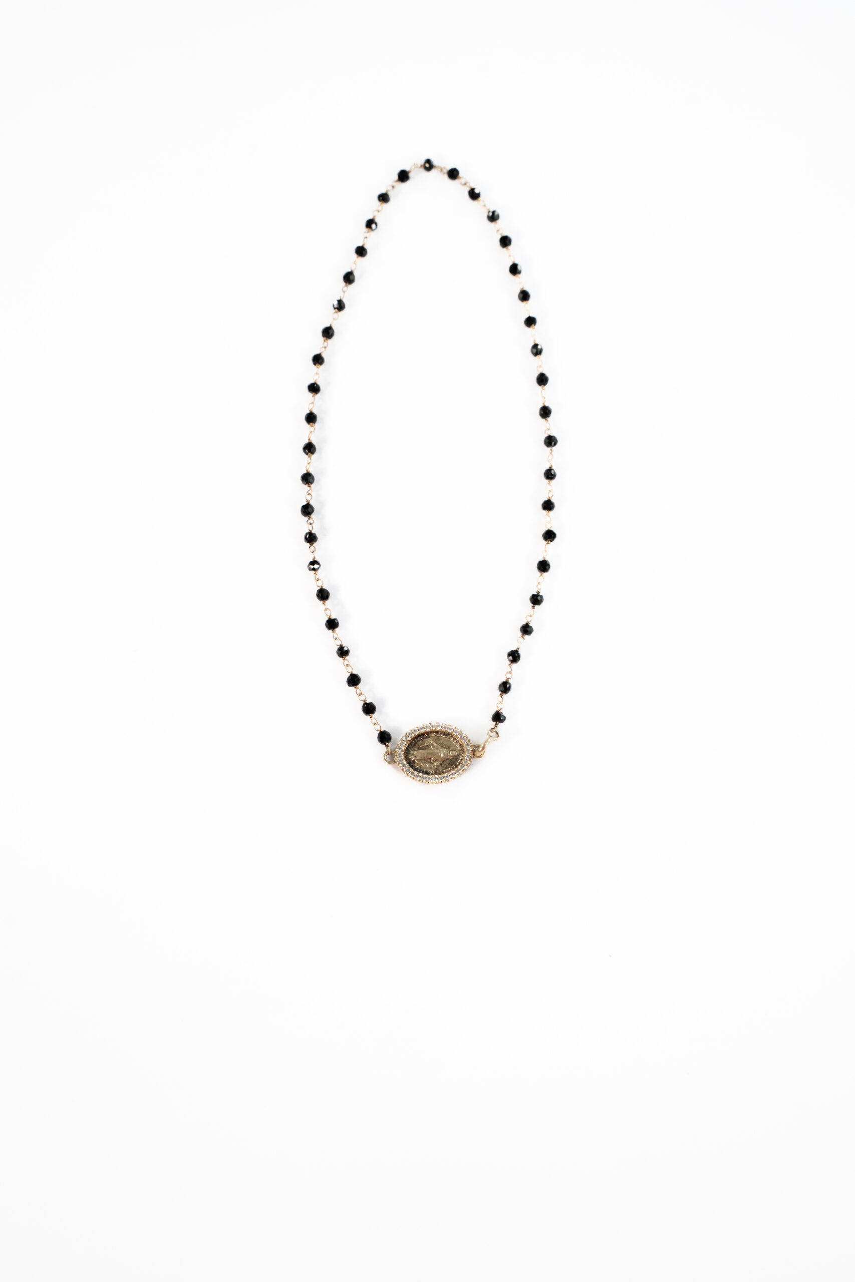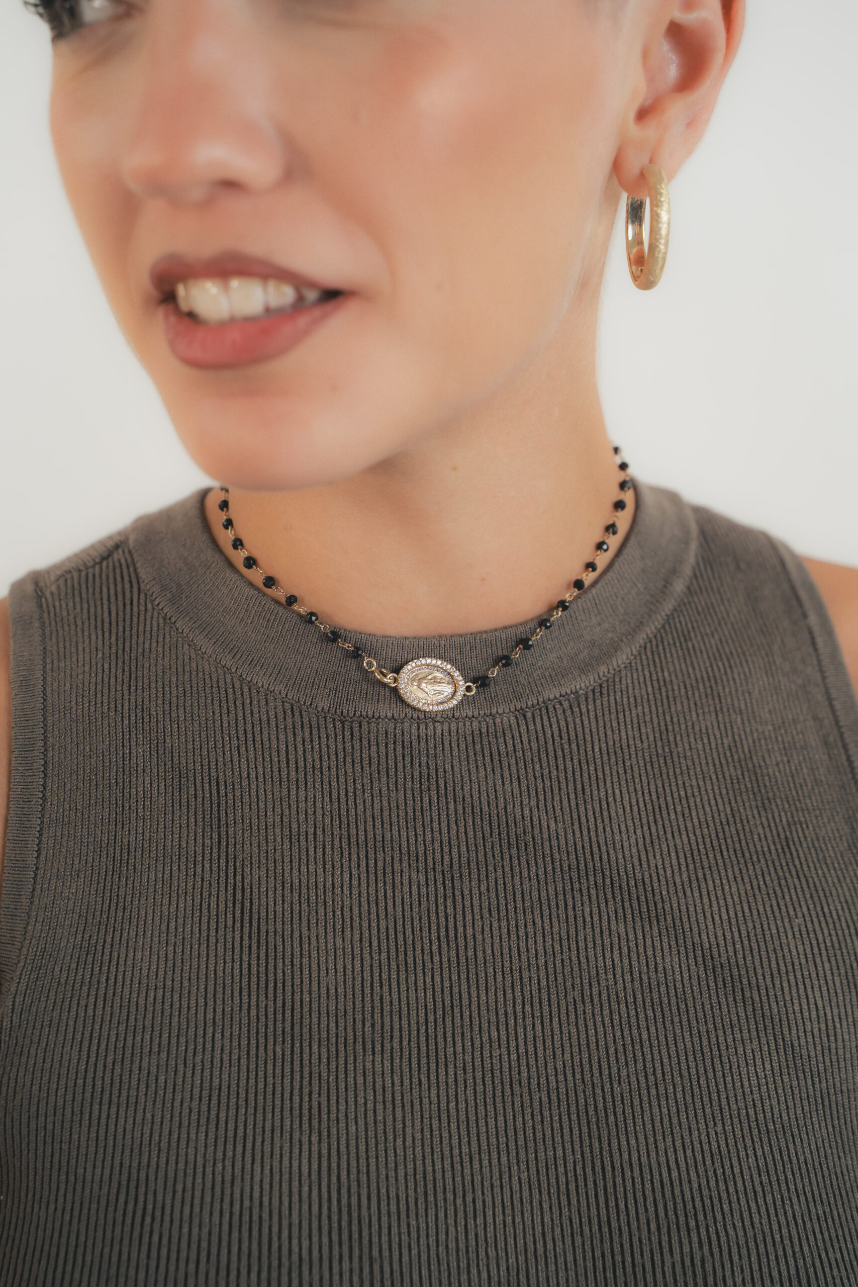 Rosari daurat amb boletes d’ònix negre, que combina espiritualitat i estil sofisticat. Una peça refinada i atemporal, ideal per a qualsevol ocasió.