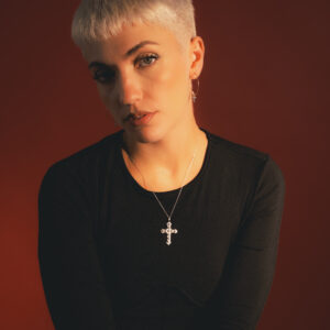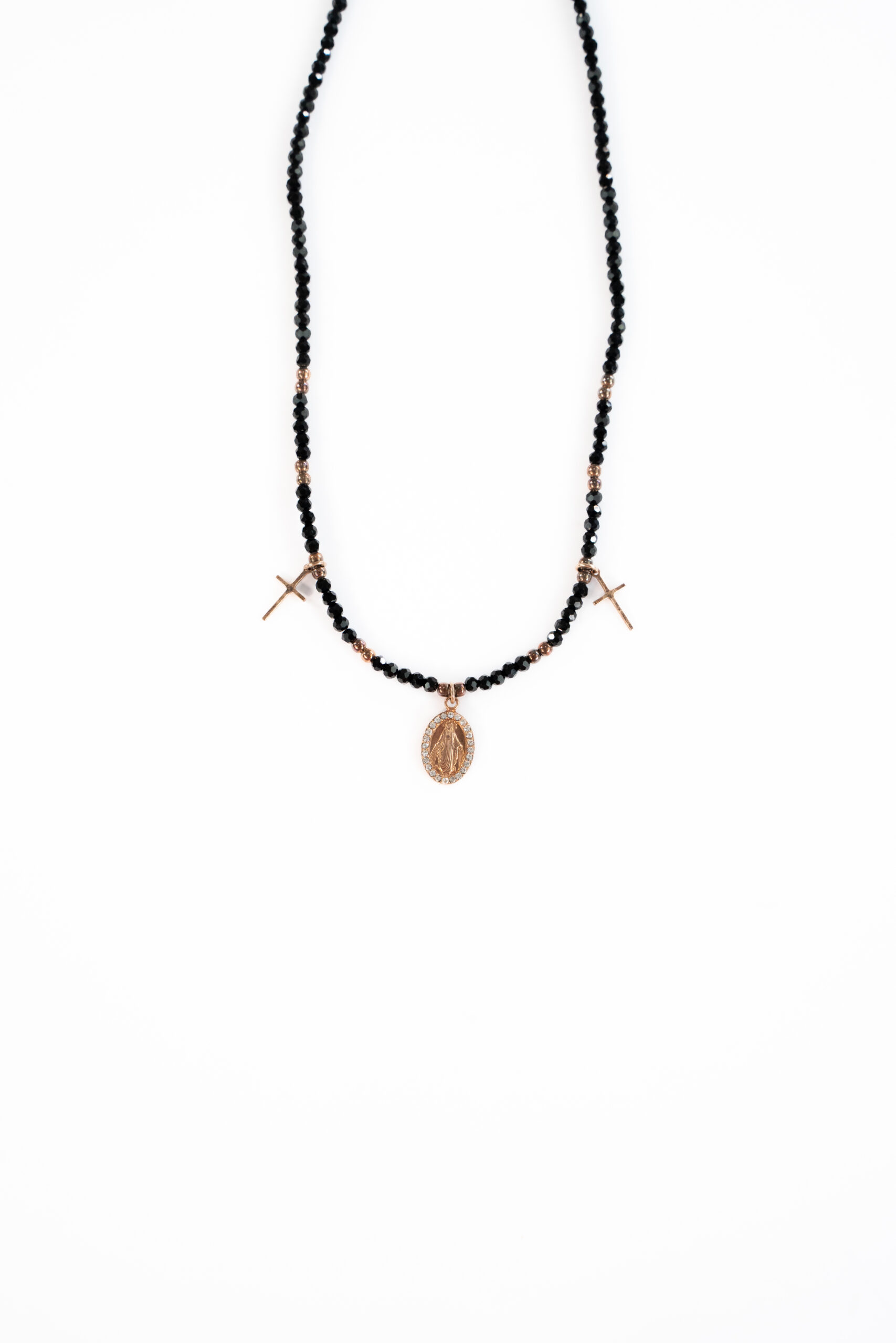 Rosari d’ònix amb penjoll de la Verge Miraculosa i dues creus en plata rosa.
