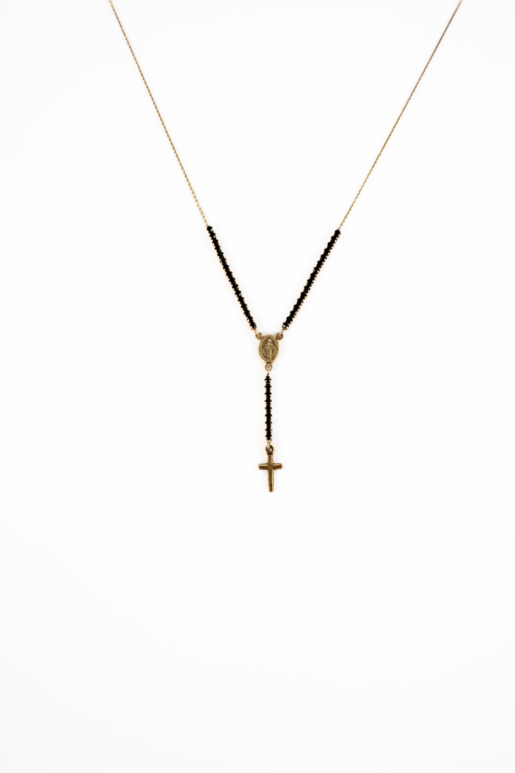 Rosari de plata daurada amb circonites negres, que combina espiritualitat i estil sofisticat. Una peça refinada i moderna, plena de llum i contrast.